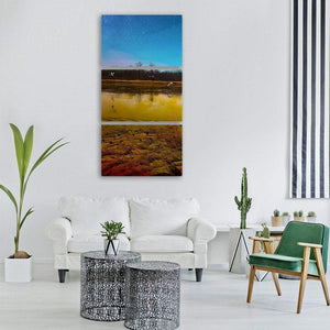 Three swans fly above a moonlit river in a modern, abstract landscape that mixes blue, yellow, orange and red. The composition follows the rule of thirds with stars in the night sky and a serene, vibrant, otherworldly mood—made to sit comfortably as contemporary room decor.