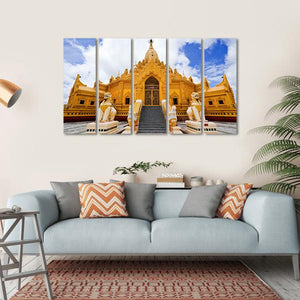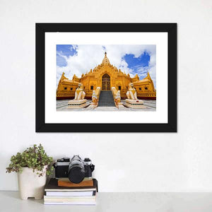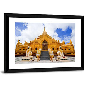 This artwork features the grand Swe Taw Myat Temple, showcasing its ornate architecture and majestic lion statues flanking the stairs. The harmonious blend of gold, blue, and white details creates a serene yet powerful atmosphere, perfect for any space that embraces themes of Buddhism and culture.
