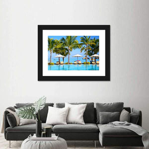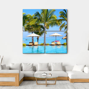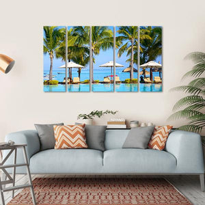 Bring the serenity of a tropical resort to your space with this captivating canvas artwork. Featuring a tranquil swimming pool surrounded by palm trees and lounge chairs, it evokes feelings of relaxation and vacation in any room.