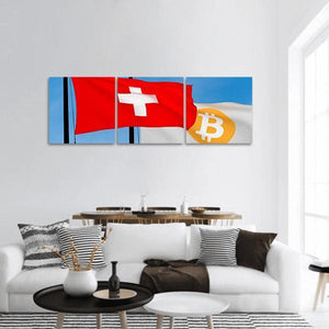 Swiss flag and the Bitcoin logo meet in a bold, modern graphic composition that reads conceptual and contemporary. Composed using the rule of thirds with a red, white, yellow, and blue palette, this colorful canvas fits well as wall decor in contemporary rooms or home offices.