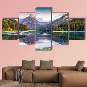 Swiss Lake Obersee presents a serene, realistic landscape of mountains, a calm lake and tree-covered slopes. Soft blues and greens with touches of pink and brown emphasize the lake’s mirrorlike reflection, rocky shore and light wildflowers. A quiet, nature-focused piece that suits modern living spaces and bedrooms.