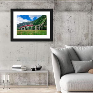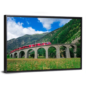 This realistic landscape shows a red Bernina train crossing a stone arch bridge set against green mountains and a soft sky. The scene reads picturesque and serene, and it suits modern living spaces and room decor.