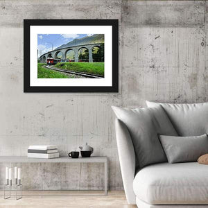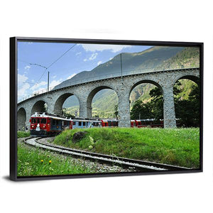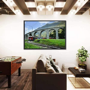 Capture the breathtaking journey of the red and white Bernina Express train as it gracefully travels through Switzerland's majestic mountainous landscapes. This artwork features a striking stone viaduct surrounded by a harmonious palette of green, gray, and blue, evoking a serene and grand atmosphere.
