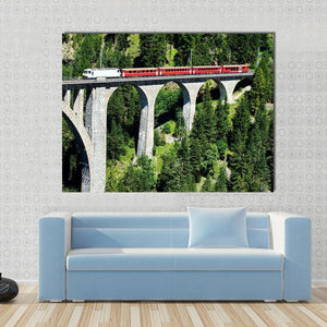 This captivating canvas art features a red passenger train crossing a majestic stone viaduct bridge nestled in the lush green landscape of Switzerland. The scene evokes a sense of adventure and wonder, making it a perfect addition to any room seeking a scenic touch.