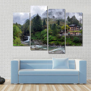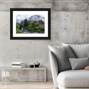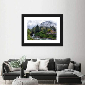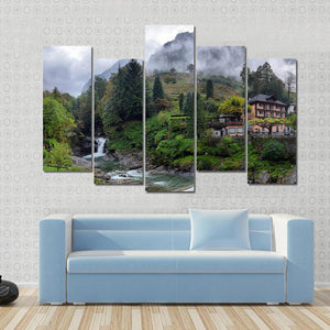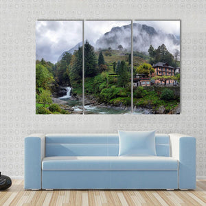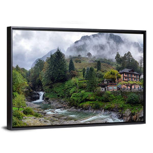 This canvas wall art captures a serene Swiss landscape, featuring a charming village house nestled among foggy mountains and a rushing waterfall. The natural hues of green and gray create a picturesque scene that brings calmness and beauty to any space.