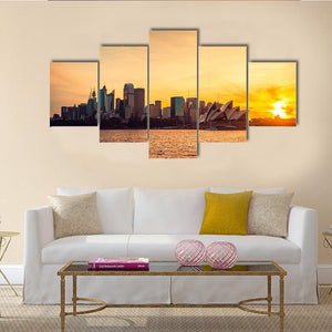 A photorealistic canvas of the Sydney skyline featuring the Opera House set against a warm orange and cool blue sunset. The tranquil yet vibrant scene—water in the foreground and city skyscrapers—works well in modern room decor or coastal-inspired spaces.