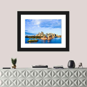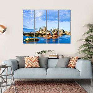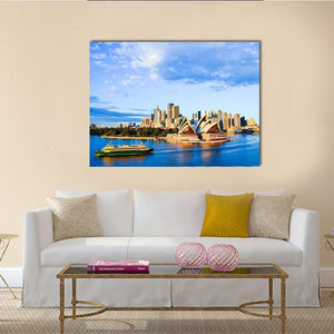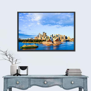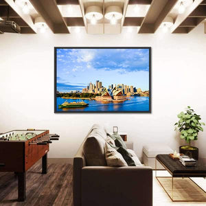 This vibrant canvas wall art captures the iconic Sydney Opera House against a bright, sunny skyline. The clear blue water and green ferry evoke an energetic atmosphere, making it an ideal piece for cityscape lovers.