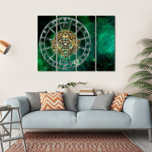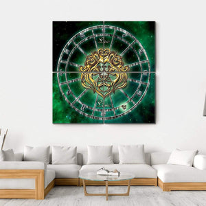 Celebrate the Leo zodiac with this captivating canvas art featuring a circular zodiac wheel and a striking gold lion emblem. The mystical green nebula background adds a cosmic touch, making it a perfect piece for astrology enthusiasts.