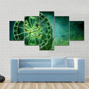This canvas shows the Pisces zodiac symbol in a glowing neon green at the center of a circular astrological chart, set against a dark, textured background with blue and green hints. The piece reads "Pisces" above and "Fische" below, giving a mystical, cosmic feel that complements modern, celestial-themed interiors.