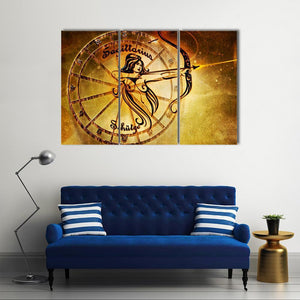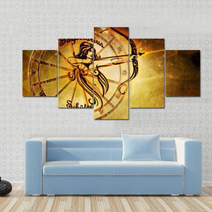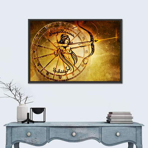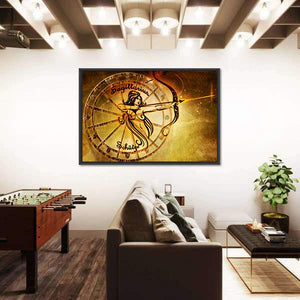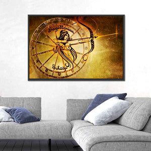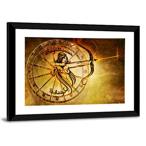 A centered depiction of the Sagittarius archer and its constellation, set against a celestial background with zodiac symbols and a golden circular border. Rendered in a vintage, illustrative style with gold, brown, and black tones, the piece reads as mystical and celestial. It fits well with astrology-focused or vintage-inspired wall decor.