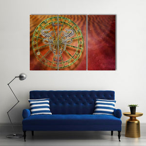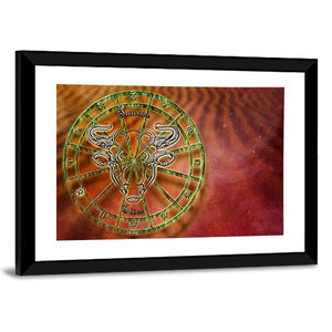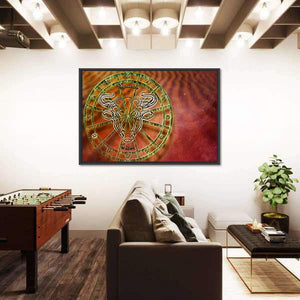 This canvas wall art centers the Taurus zodiac symbol — the bull’s-head motif — inside an ornate astrology wheel. Rendered in gold, green, red, orange, and brown, it gives a mystical, cosmic, symbolic mood and suits modern or astrology-themed decor as a quiet focal piece.