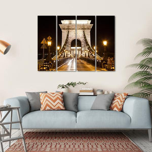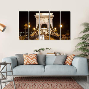 This captivating canvas features the iconic Szechenyi Chain Bridge in Budapest, illuminated against a dramatic night sky. The photorealistic details, including streaks of vehicle lights, create an enchanting urban scene that brings life to any space.