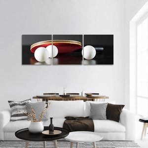 This canvas shows a red ping pong paddle with yellow trim and three white ping pong balls arranged using the rule of thirds. The modern, minimalist composition gives a sporty, focused feel and works well in game rooms, sports spaces, or contemporary interiors that favor clean, dynamic pieces.