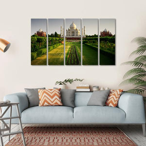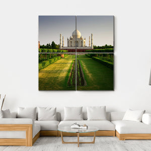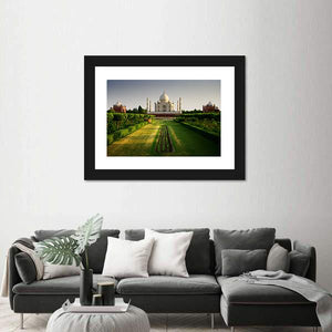 Experience the beauty of the Taj Mahal from its serene gardens. This canvas print captures the iconic marble mausoleum amid manicured greenery and reflective pools, evoking a peaceful and majestic atmosphere.