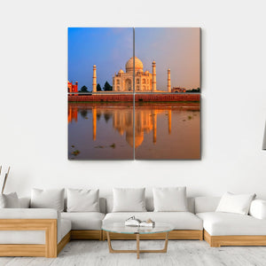 This canvas art captures the serene beauty of the Taj Mahal, reflecting in the peaceful waters at dawn. With its symmetrical composition and a palette of white, red, blue, and orange, it adds a touch of grandeur to your space.