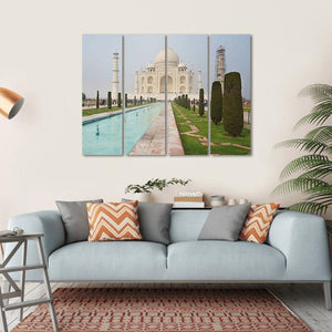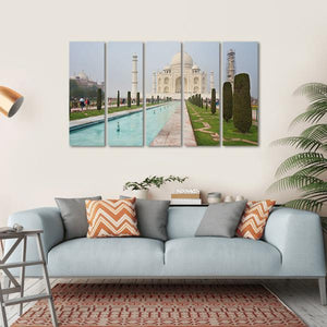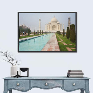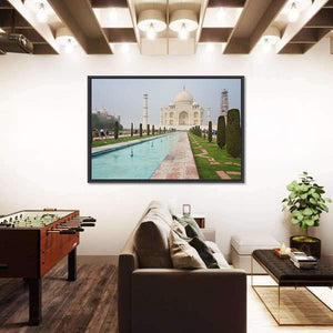 This serene canvas art captures the majestic Taj Mahal, surrounded by lush gardens and a tranquil reflecting pool. With its realistic portrayal and calming color palette, it's a beautiful addition to any wall decor, evoking a peaceful atmosphere.