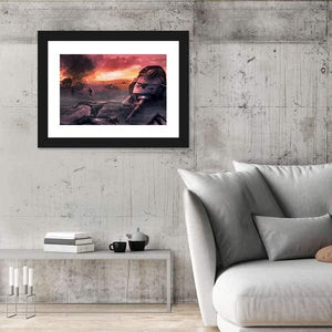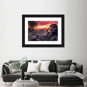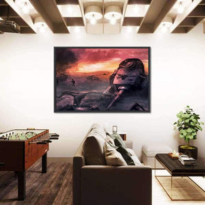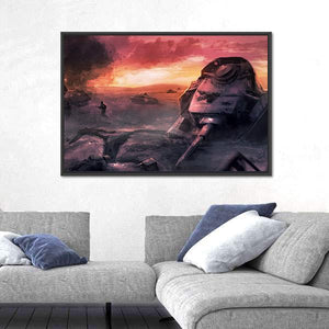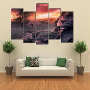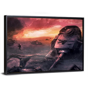Tank War Battle Canvas Wall Art depicts a dramatic war scene with tanks, soldiers, explosions, a tank on fire and a towering mech amid large mechanical wreckage beneath a setting sun. Rendered in reds, blacks and greys with dramatic lighting, it creates an intense, chaotic and somber atmosphere that suits modern home decor.