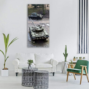 This canvas print features two military tanks—one numbered 235—in olive green, brown, grey, and black tones with a photorealistic, vintage feel. The image conveys a historical, industrial mood that reads like a museum photograph. It suits industrial, military-themed, or modern room decor.
