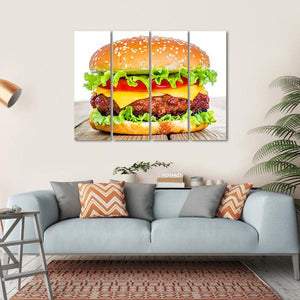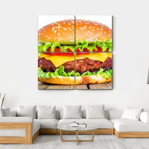 This vibrant canvas print showcases a delicious cheeseburger, featuring a sesame seed bun layered with lettuce, tomato, and cheese. Its photorealistic style captures the appetizing essence of fast food, making it a great addition to any kitchen or dining area.