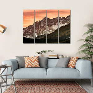This landscape art piece beautifully captures the Tatra Mountains, showcasing snow-capped peaks under a dramatic sunset sky. The serene palette of orange, white, green, and brown evokes a tranquil atmosphere, making it an inviting addition to any room decor.