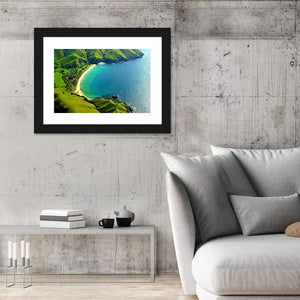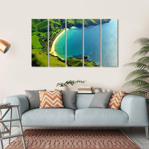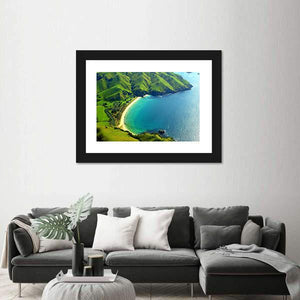 This canvas art captures the serene beauty of Taupo Bay, featuring lush green hills and a curving white sand beach. The deep blue ocean and a winding river complete this picturesque landscape, making it a perfect addition to your home decor.