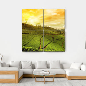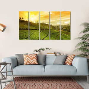 This canvas art captures a serene tea plantation nestled among layered hills during a warm sunset. The lush greens and gentle oranges evoke a peaceful atmosphere, making it a perfect addition to any nature-inspired décor.