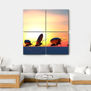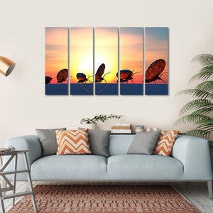 This canvas art features silhouettes of ants moving stones at sunrise, creating a dramatic and adventurous scene. The vibrant palette of orange and yellow against blue and black enhances the surreal landscape, making it a captivating piece for any room.