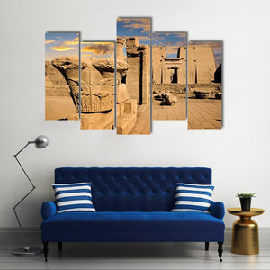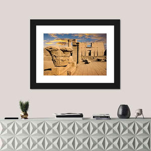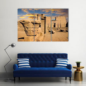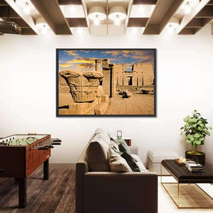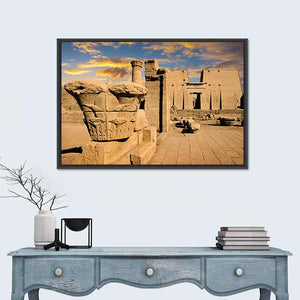 This canvas art features the ancient ruins of the Temple of Edfu, showcasing a majestic facade beneath a dramatic sky. The serene palette of tan, blue, orange, and gold captures the historical essence and beauty of this iconic structure.