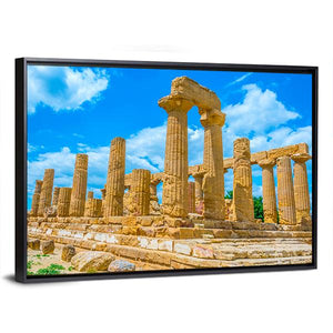 This canvas depicts the Temple of Juno — an eye-level, medium-shot view of ancient ruins and Doric columns beneath a bright blue sky with soft clouds. The realistic landscape uses tan, brown and white tones to create a historic, serene mood. It works well as house and room decor and fits with modern canvas art collections.