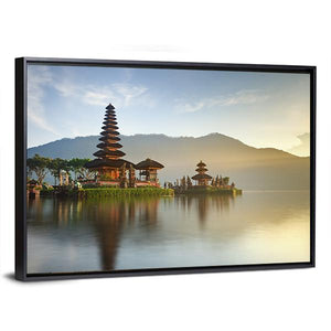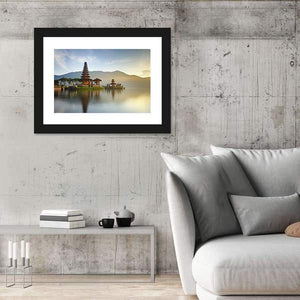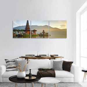 This panoramic canvas shows a pagoda-style temple on the lake, set against mountains and a wide sky with sunset lighting. The realistic landscape uses blues, greens, browns, yellows, and oranges to create a serene, peaceful, majestic mood. Ideal as room decor for modern living rooms or bedrooms.