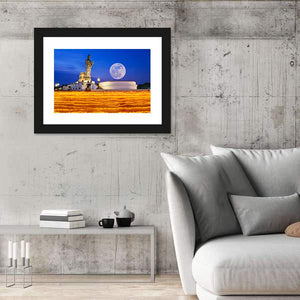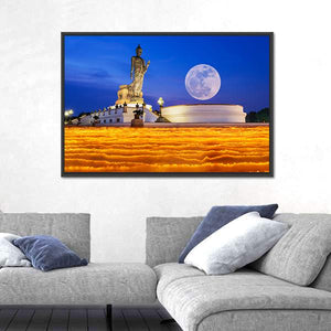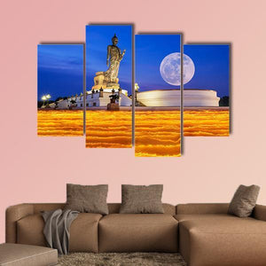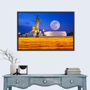 A realistic canvas scene of a temple in Thailand: a large standing Buddha beneath a full moon with rows of lit candles. Rendered in blue, golden and white tones and composed using the rule of thirds, it gives a spiritual, serene and grand atmosphere. Works well in a modern living room or a quiet meditation corner.