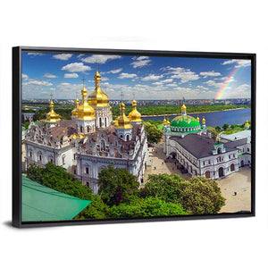 A panoramic view of the cathedral complex in Kiev, Ukraine featuring golden domes and green rooftops beside a river. Rendered realistically in bright gold, green, blue, and white tones, the scene feels serene and majestic with a hint of rainbow over the distant city. Suited to modern living rooms or faith‑inspired spaces that need a calm focal piece.