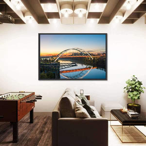 This captivating canvas art features the serene skyline of Nashville at dusk, showcasing an arched bridge beautifully illuminated. The tranquil blue and vibrant orange hues reflect off the water, creating a peaceful atmosphere that complements various decor styles.