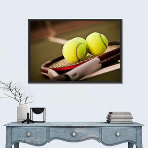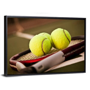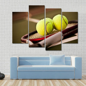 Capture your love for tennis with this vibrant wall art featuring two yellow tennis balls atop a dynamic red and white racket. The sporty and focused atmosphere brings energy to any space, perfect for game rooms or modern decor.
