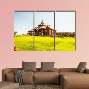 This photorealistic canvas shows a temple with a multi-tiered roof set against a bright blue sky and a green lawn. The scene reads peaceful, serene, and bright. It works well in modern homes as room decor, for example in living rooms or hallways.