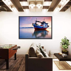 A realistic panoramic canvas of a fishing boat anchored offshore beneath a dramatic sunset sky. Blues, pinks, purples and warm oranges create a serene, peaceful, and colorful atmosphere. Suited to coastal or modern room decor that welcomes calm, seaside imagery.