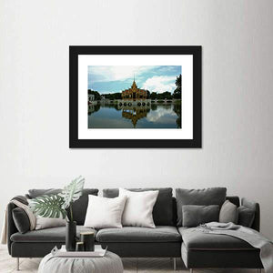 This canvas art features a serene view of a traditional Thai temple reflected in calm waters, framed by delicate bridges and gentle clouds. The ornate architecture and layered roofs capture the majestic beauty of Thailand, adding a tranquil touch to your space.