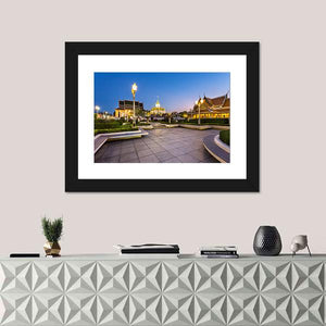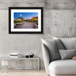 This realistic canvas depicts a Thai pavilion temple complex at dusk, with ornate architecture, manicured gardens, and lampposts beneath a night sky. A blue, gold, green, and grey palette and a rule-of-thirds composition give the scene a serene, majestic, and tranquil feel with clear depth. The piece suits modern home and room decor.