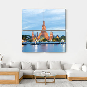 This canvas features the serene Wat Arun temple against the backdrop of a vibrant skyline and calm river. The photorealistic depiction captures the majesty of twilight, inviting a historic yet tranquil atmosphere into your space.