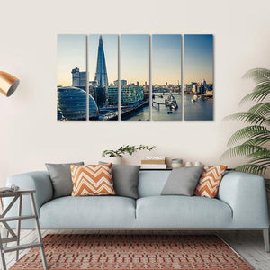 This vibrant canvas captures the lively skyline of London along the Thames. Featuring modern glass buildings and boats under a clear sky, it adds a fresh, urban touch to any space.