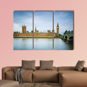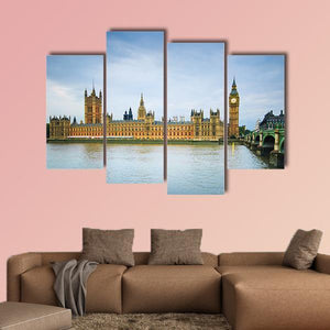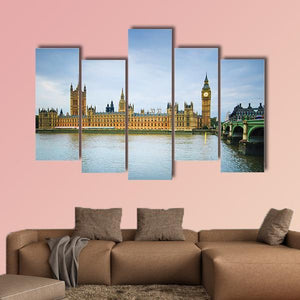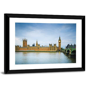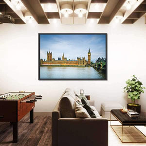 A photorealistic view of the River Thames with Elizabeth Tower and the Palace of Westminster under a clear blue sky. The scene reads iconic, majestic, and serene, with calm water reflecting the buildings in a blue, tan, grey, and white palette — a quiet focal point for modern or classic living spaces and studies.