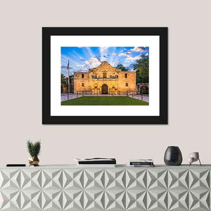 This canvas wall art features the historic Alamo in San Antonio, Texas, set against a grand sky. The balanced composition and carefully chosen palette of beige, blue, green, and yellow evoke a sense of pride and place, making it a striking addition to your decor.