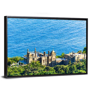 A photorealistic panoramic view of Alupka Palace in Crimea, showing a stone castle with turrets above bright blue ocean water and coastal cliffs, surrounded by dense green foliage. The scene reads majestic and serene with a historic atmosphere, rendered in blues, greens, browns, and tans. Suited for modern or coastal room decor such as a living room or study.