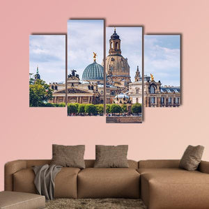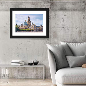 This cityscape captures Dresden’s historic riverfront, with a large central dome, smaller domes, rooftop statues and a tree-lined bank. The blue, brown and gold palette gives the scene a majestic, historic, and serene feel. It works well in modern or classic home interiors and room decor.
