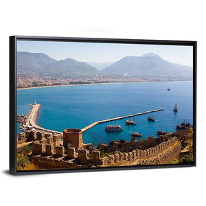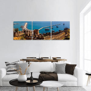 Red Tower, Turkey Panoramic Canvas shows a photorealistic wide view of an ancient fortress and harbor in Turkey. Sunlit stone walls, a watchtower, boats at the pier and a distant lighthouse create a historic, serene seaside mood. Works well in coastal or modern room decor.