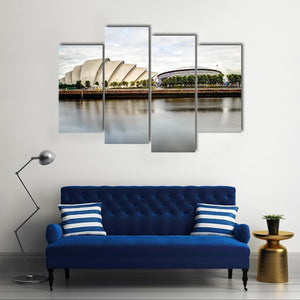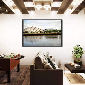 This stunning cityscape features the modern architecture of the Armadillo Auditorium set against a serene river and sky. The calm palette of blue, white, and gray enhances its realistic depiction, making it a beautiful addition to contemporary decor.
