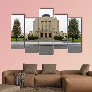 This canvas image presents a classical state theater in a centered, symmetrical composition, with a domed roof, columned entrance, and sculptures flanking the approach. The beige, green, and gray palette and formal, stately mood suit classical or ornate interiors. It works well as a restrained focal point on neutral walls.