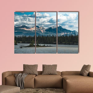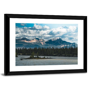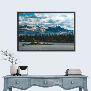 Athabasca River, Canada, captured as a landscape canvas with snow-capped mountains, a pine forest, a small island in the lake, and fluffy clouds. The blue-green palette and serene, majestic mood suit a living room or rustic cabin looking for nature-focused wall decor.