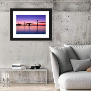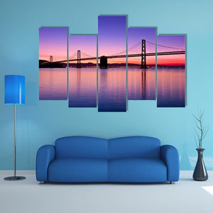 The Bay Bridge in San Francisco appears at sunset, with bridge, water, and sky rendered in purple, blue, orange, and pink. The rule of thirds composition highlights the bridge’s X-shaped pylons and creates a serene, tranquil mood that fits modern living spaces or office walls.