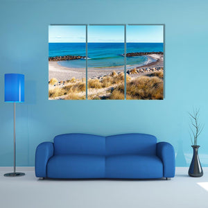 This canvas wall art captures the serene beauty of a beach at Skagen, Denmark. Featuring calm ocean waters, grassy dunes, and rocky breakwaters, it evokes a tranquil atmosphere perfect for any nature lover.